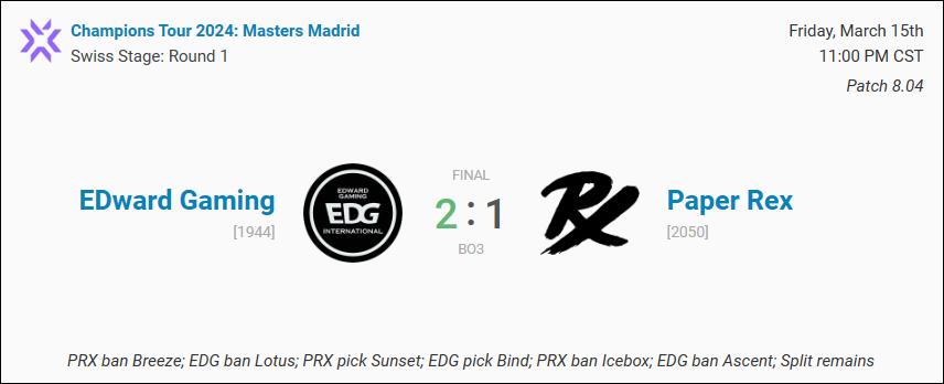 在今天凌晨,無畏契約馬德里大師賽的瑞士輪上,EDG以2:1的比分戰勝了曾在國際賽場多次交手的前世界亞軍PRX。