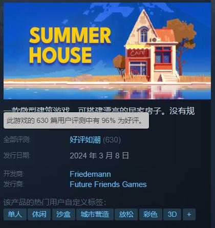 今天給大家推薦的是輕鬆風的建造遊戲《SUMMERHOUSE》,遊戲3月8日上線Steam,收穫了630條評價,好評率96%“好評如潮”。