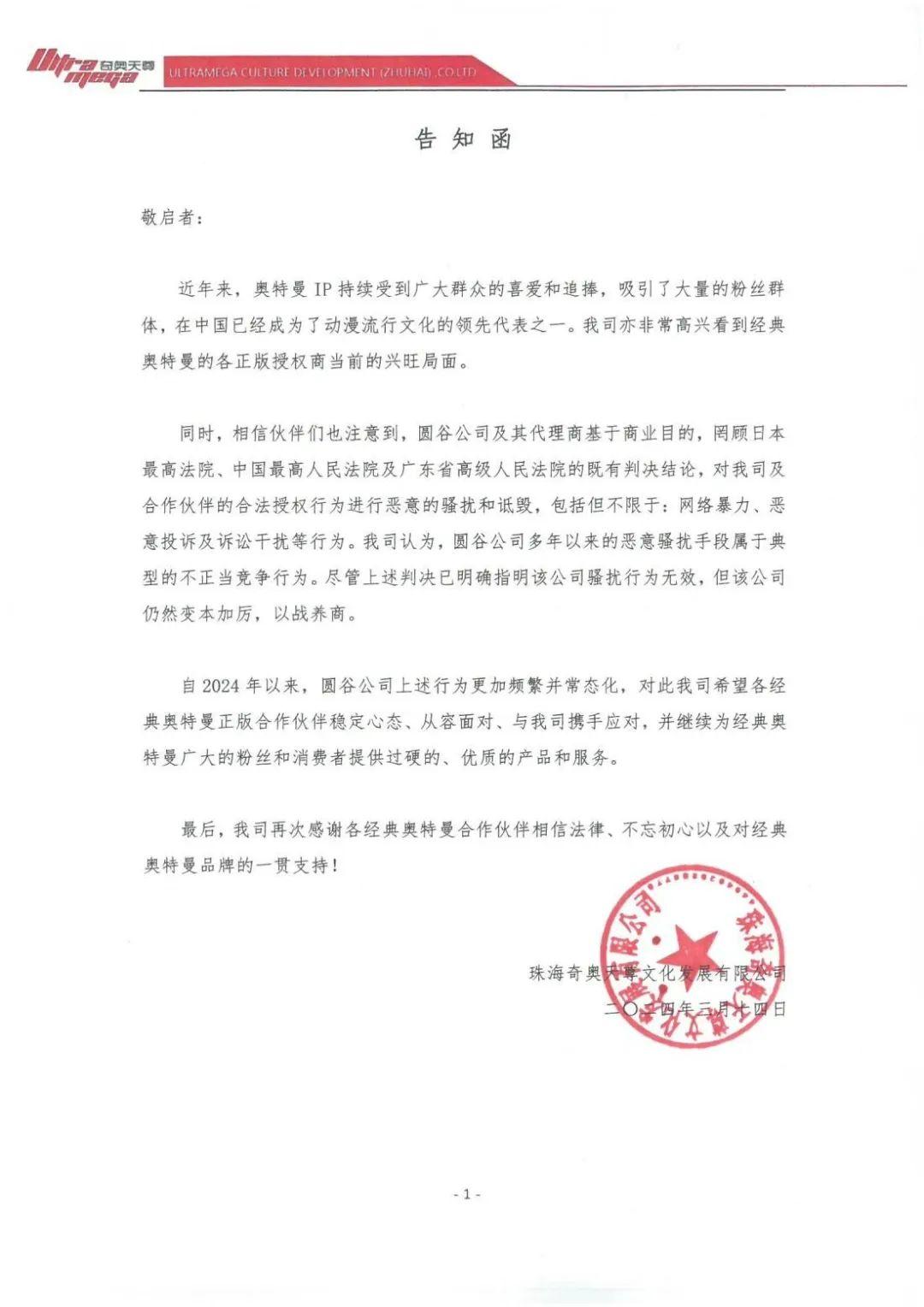 3月14日,奇奧天尊——也就是卡遊侵權案的勝訴方——在公開平臺上發佈了告知函,控訴圓谷公司及其代理商對自己進行騷擾和詆譭,而且從2024年起情況愈演愈烈。