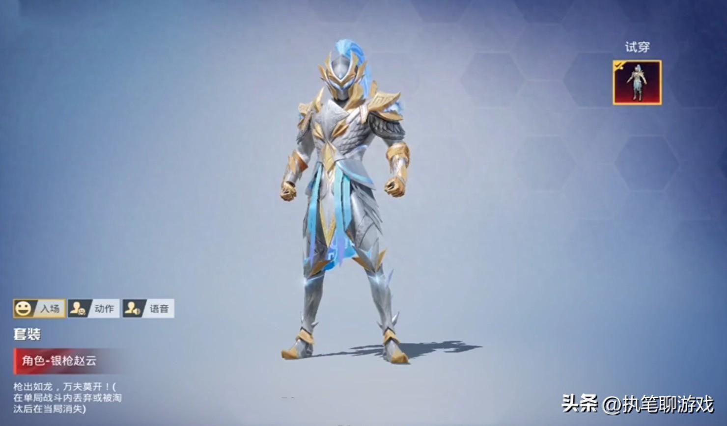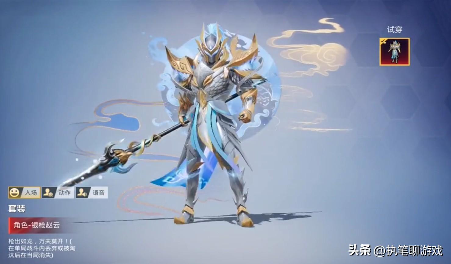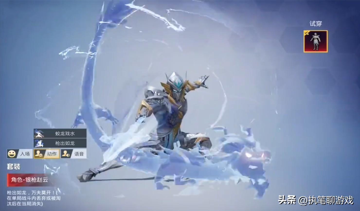 言歸正傳,傳說級神裝擁有專屬的入場動作以及語音等特效,以銀槍趙雲爲例,專屬動作蛟龍戲水、槍出如龍,還是相當炫酷的,起碼比起粉級套裝的特效來講,光子也算是煞費苦心了,動態例子、光影等特效的細節相當到位。