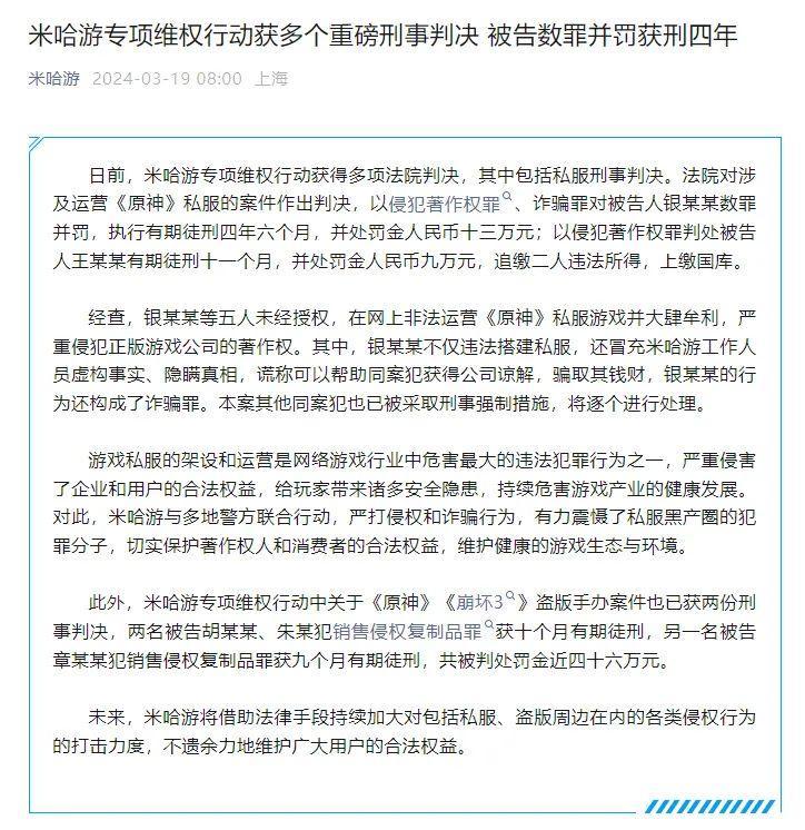 主要針對《原神》私服,《原神》《崩壞3》盜版手辦等非法牟利行爲,法院已經作出了判決。多名被告獲有期徒刑,並被追繳違法所得、判罰金。