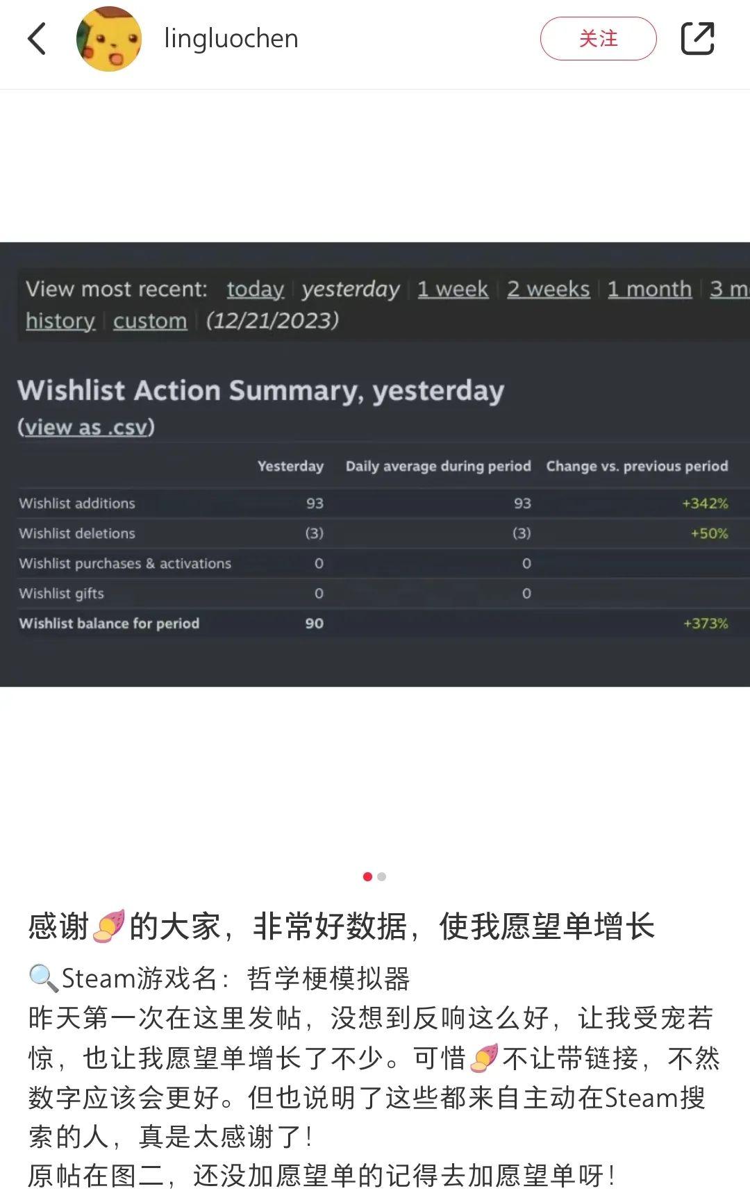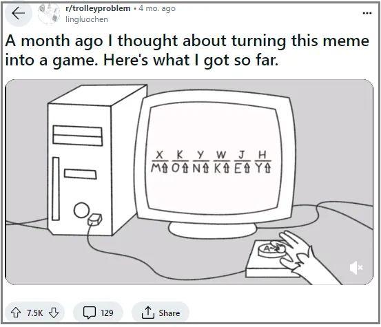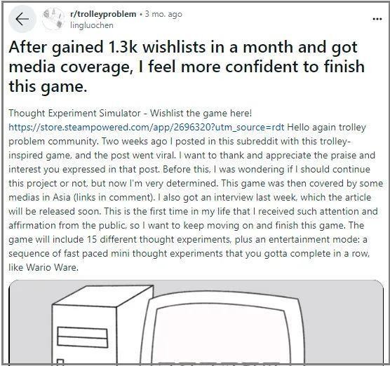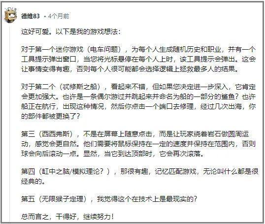 去年底,他們公佈了旗下首款遊戲,也就是最下方的《哲學梗模擬器》。遊戲畫面主打一個線條極致簡約,但看起來無比熟悉。我先不介紹,放幾張圖,大家盲猜一下分別對應的是什麼。根據Steam頁面的介紹,《哲學梗模擬器》的靈感來自於現在被玩壞的電車難題梗,在此基礎上,把更多哲學思想實驗做成了點擊式遊戲。比如忒修斯之船,講的是一艘船在航行中受到損傷,就要換掉一些組件。那麼如果一艘船最終換掉了全部組件,它還是不是一開始的那艘船呢?再比如無限猴子,這是概率學的一個概念,講的是讓無知的猴子對着打字機敲鍵盤,在無限的時間中,猴子靠亂打也有可能敲出一部莎士比亞鉅作。另外還有缸中之腦,西西弗斯,囚徒困境,薛定諤的貓等等等等,在遊戲中以一種搞笑的方式呈現,讓玩家身臨其境地成爲場景中哲學家的化身。《哲學梗模擬器》在國內的知名度不算高,Steam心願單的前排很難看到這個名字。不過意外的是,當製作人把一支一分鐘的遊戲視頻發到國外論壇Reddit上,卻受到了熱烈的歡迎。而且不止在歐美,《哲學梗模擬器》似乎在日本受到的關注要更多。日本媒體4Gamer也報道了這個遊戲,據當時的新聞描述,《哲學梗模擬器》有50%的願望單數據都來自日本玩家,前三名的國家分別爲日本、美國和中國。遊戲在海外的意外走紅,讓製作團隊非常驚喜。製作人在Reddit發帖,稱這是人生中第一次受到公衆如此多的關注和肯定。他曾經猶豫過是否要繼續進行這個項目,但如今他已經非常有信心能夠完成,並且透露了,遊戲將包括15個不同的思維實驗。另外,HoHo Game Studio表示每個月都將把收入的5%捐贈給聯合國危機救助基金,以幫助那些受到戰爭、飢餓和自然災害影響的人們。這一承諾適用於HoHo Game Studio當前以及未來的所有遊戲。現在,製作人還在小紅書等國內論壇上發帖,爲遊戲尋求進一步曝光。他表示,希望能在今年上半年就把玩家完成,做一件能稱得上“劃上完整句號的事情”。