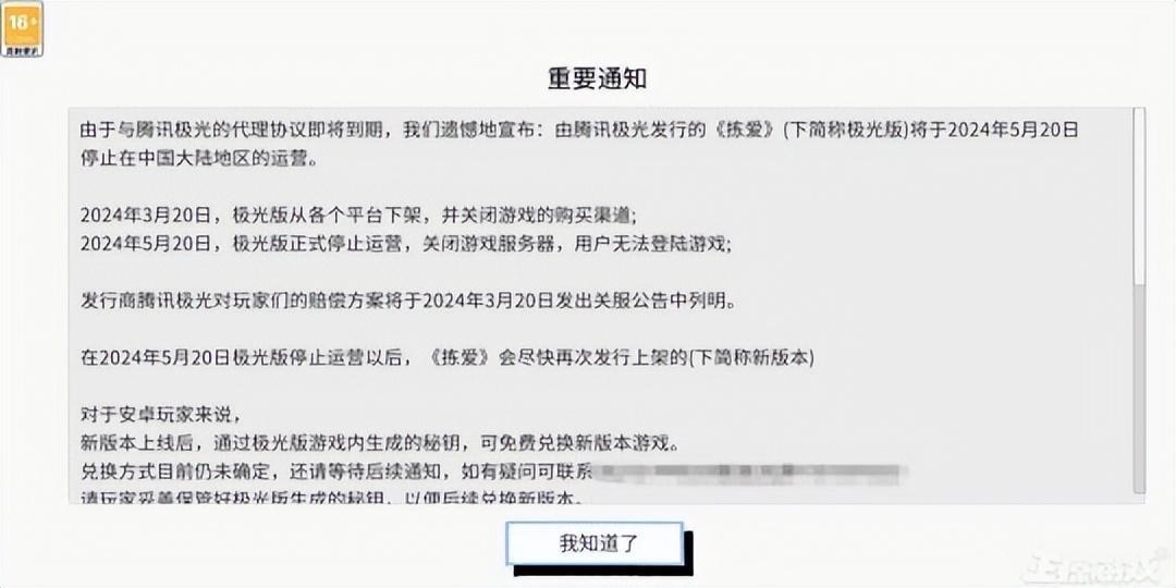 近日由AkbaStudio製作,騰訊極光代理運營的《揀愛》手遊版宣佈,因和開發商的代理協議即將到期,經與開發商友好協商,遊戲將於2024年5月20日正式停運。在今年3月20日11點前購買過《揀愛》的玩家,騰訊給的補償是可以從《桃源深處有人家》、《我的俠客》、《白荊迴廊》其中任意一款遊戲中領取到價值10Q幣的禮包。