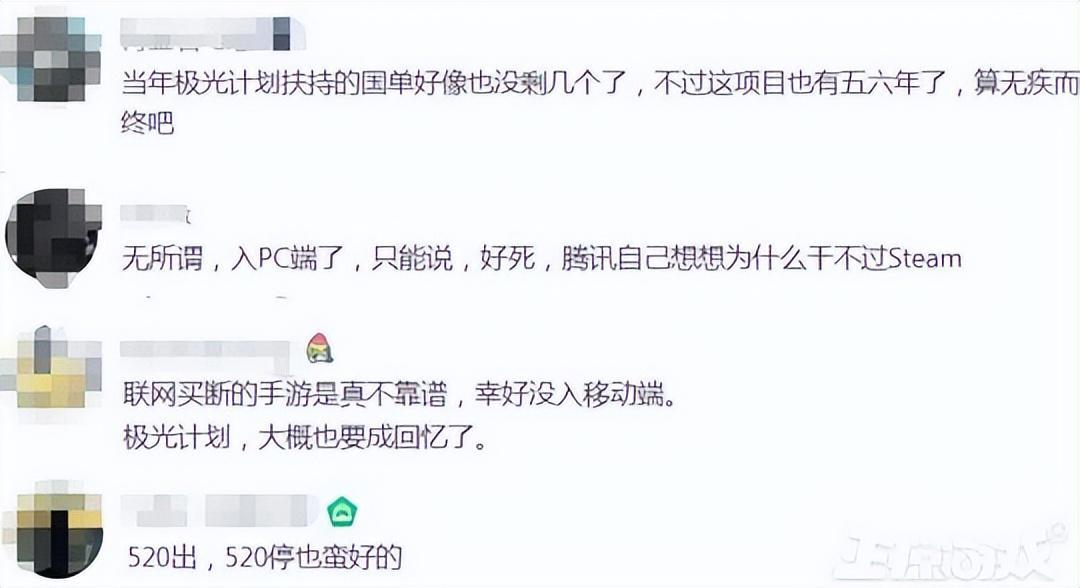 對於《揀愛》的停運,有玩家吐槽,當年極光計劃扶持的國單好像也沒剩幾個了,不過這項目也有五六年了,算無疾而終吧。還有玩家評論說,無所謂入PC端了,騰訊自己想想爲什麼幹不過Steam。還有玩家表示,聯網買斷的手遊是真不靠譜,幸好沒入移動端。極光計劃,大概也要成回憶了。