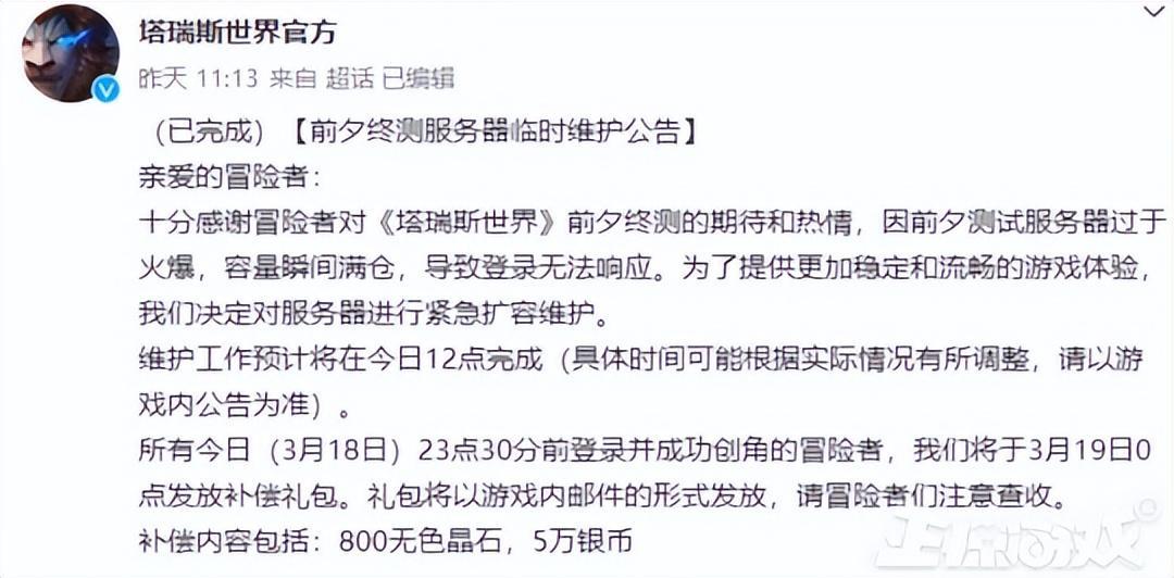 近日《塔瑞斯世界》開啓了終測,由於玩家熱情超出預期,測試首日玩家普遍在進入遊戲時需先經歷長時間排隊,並且部分玩家出現遊戲測試資格被回收的情況開發團隊不得不對服務器進行緊急擴容。爲了補償維護,運營團隊提供了800無色晶石和5萬銀幣作爲補償。