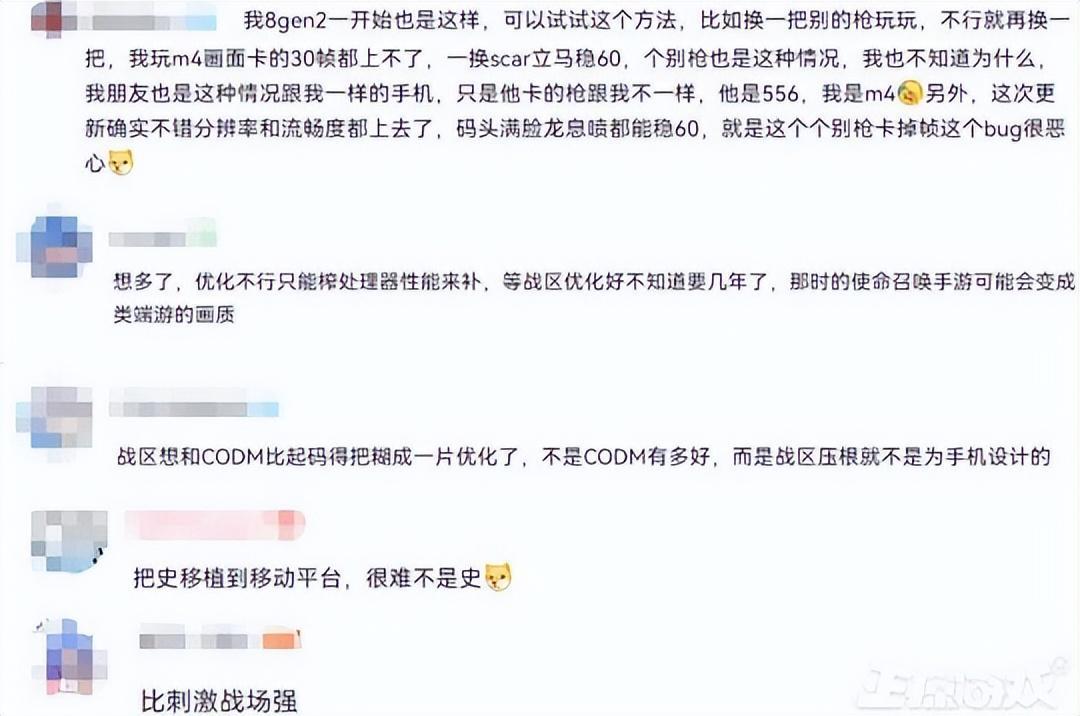 有玩家就表示,遊戲優化不行只能壓榨手機CPU來彌補,戰區優化好不知道要幾年,那時的《使命召喚》手遊可能會變成類端遊的畫質了。還有玩家吐槽,不是《使命召喚》手遊有多好,而是戰區壓根就不是爲手機設計的。有玩家調侃說,把**移植到移動平臺,很難不是**。