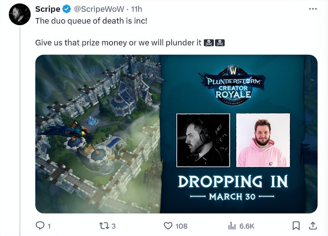 但讓人十分尷尬的是,Echo他們壓根就沒把《塔瑞斯世界》當回事,指揮Scripe帶頭在推特上大吹特吹魔獸喫雞有多好玩,並受邀參與了暴雪舉辦的喫雞大獎賽,隻字未提他們參與的《塔瑞斯世界》團本首殺爭奪戰。