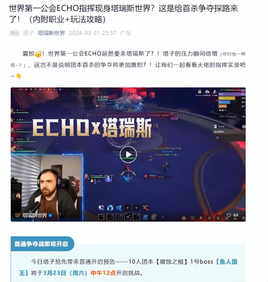 魔獸頂尖開荒團隊Echo已確認加入《塔瑞斯世界》的三測開荒挑戰,並直播了好幾個小時的副本通關實錄。根據官方介紹,Echo將會向10人團本【腐蝕之根】發起挑戰,與國服玩家一起爭奪百萬首殺獎金。