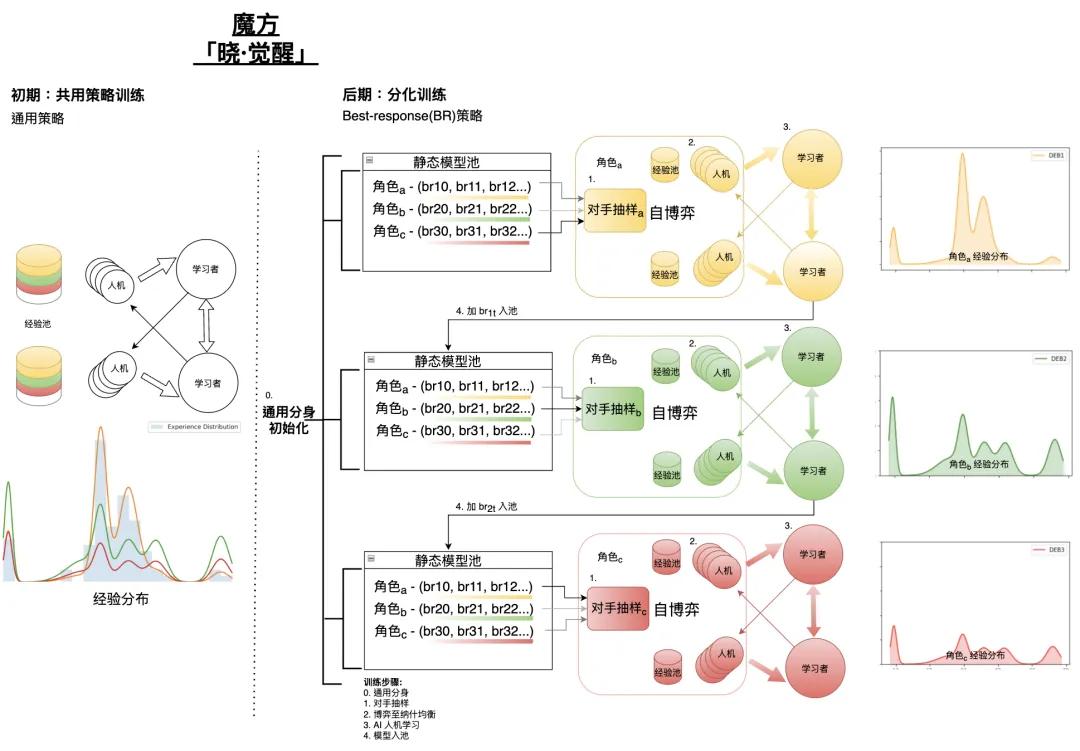 強化學習和傳統的行爲樹AI不一樣,不是靠固定的動作路數來出招,也沒有數值上的加成,而是要通過自博弈(Self-play)的訓練方法,讓AI左右互搏,模擬人類的反應、技巧,像真人一樣公平地走位、玩心機、拼操作,不斷提升水平。在技術層面,這倒不至於特別難。