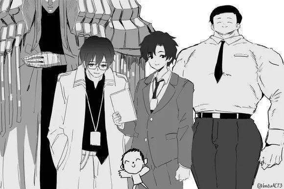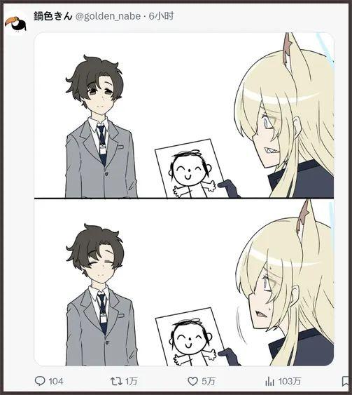 那個抽象無比的旺仔牛奶形象,也是出自阿洛娜手筆。成了梗以後,基本上所有BA本子裏的男主都會貼着這張傻笑臉登場。