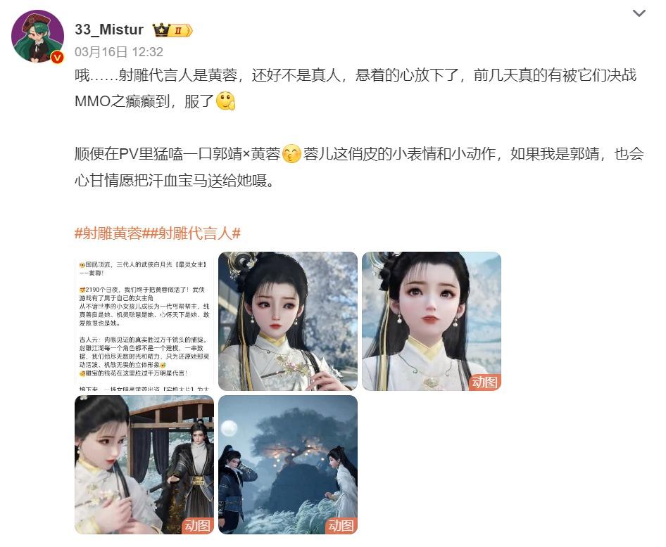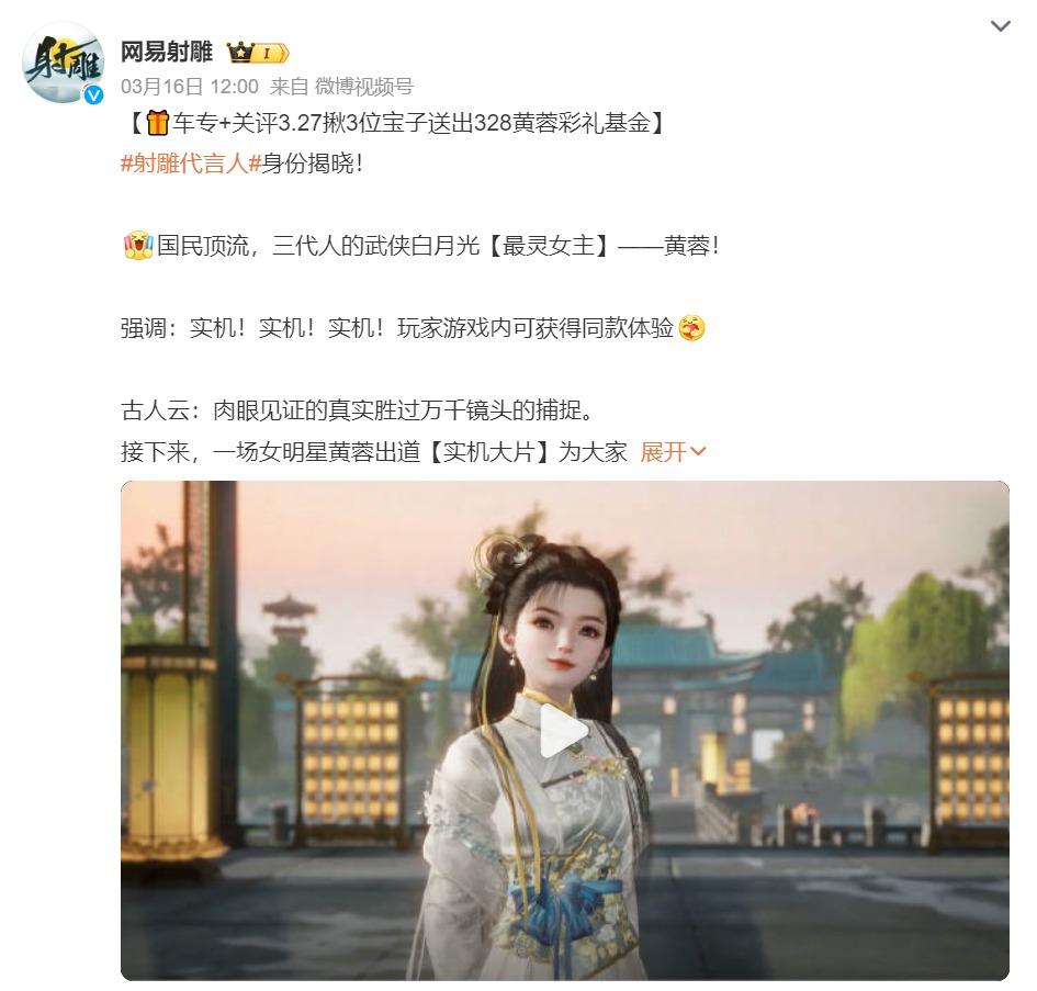 而按套路,MMO一般都會在公測時找些明星代言人,帶帶流量,背背書。《射鵰》卻是先吊足大家胃口,結果最後官宣代言人是遊戲內的虛擬角色「黃蓉」。