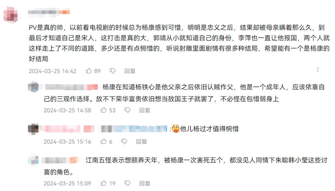 事實上,翻看《射鵰》之前發佈的劇情PV《逆子》,評論區就圍繞楊康展開了激烈討論,有人認爲他是純純的壞,但也有人心存惋惜,認爲其卿本佳人,奈何做賊。看到這種討論環境,我甚至有種到了二遊社區的錯覺。
