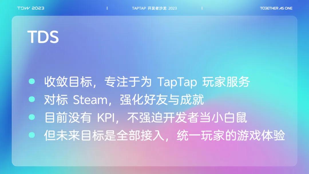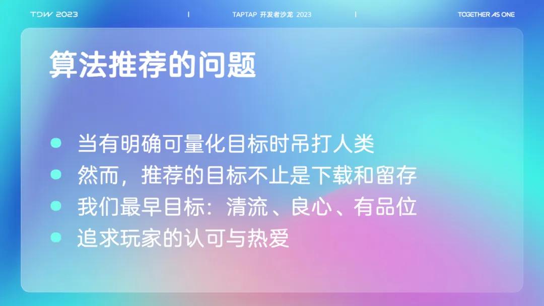 舉個簡單的例子,去年TapTap開發者沙龍上,公司高層跟開發者、玩家們做了相當詳細溝通,表示會稍微放一放數據驅動的KPI,不內卷、不躺平,強化與開發者和玩家之間的關係。