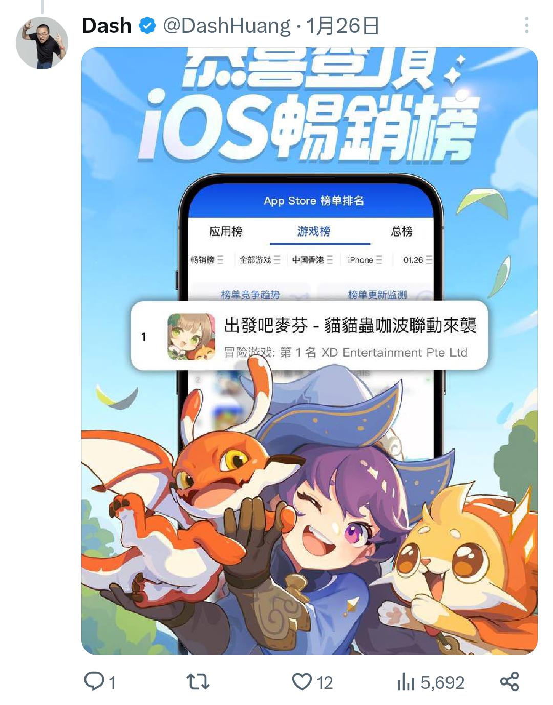 《出發吧麥芬》上線中國港澳臺兩天後,黃一孟連發了三篇帖子慶祝遊戲登頂暢銷榜。