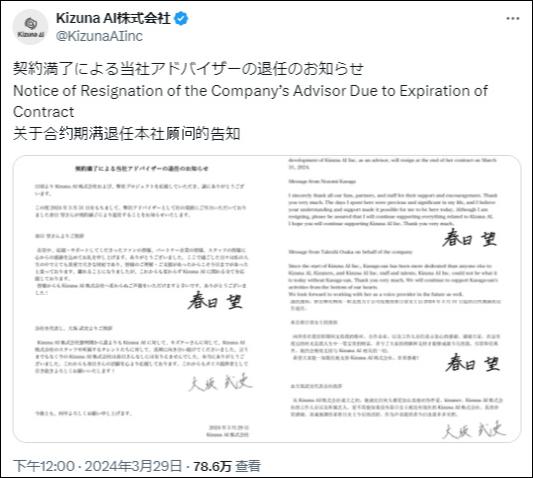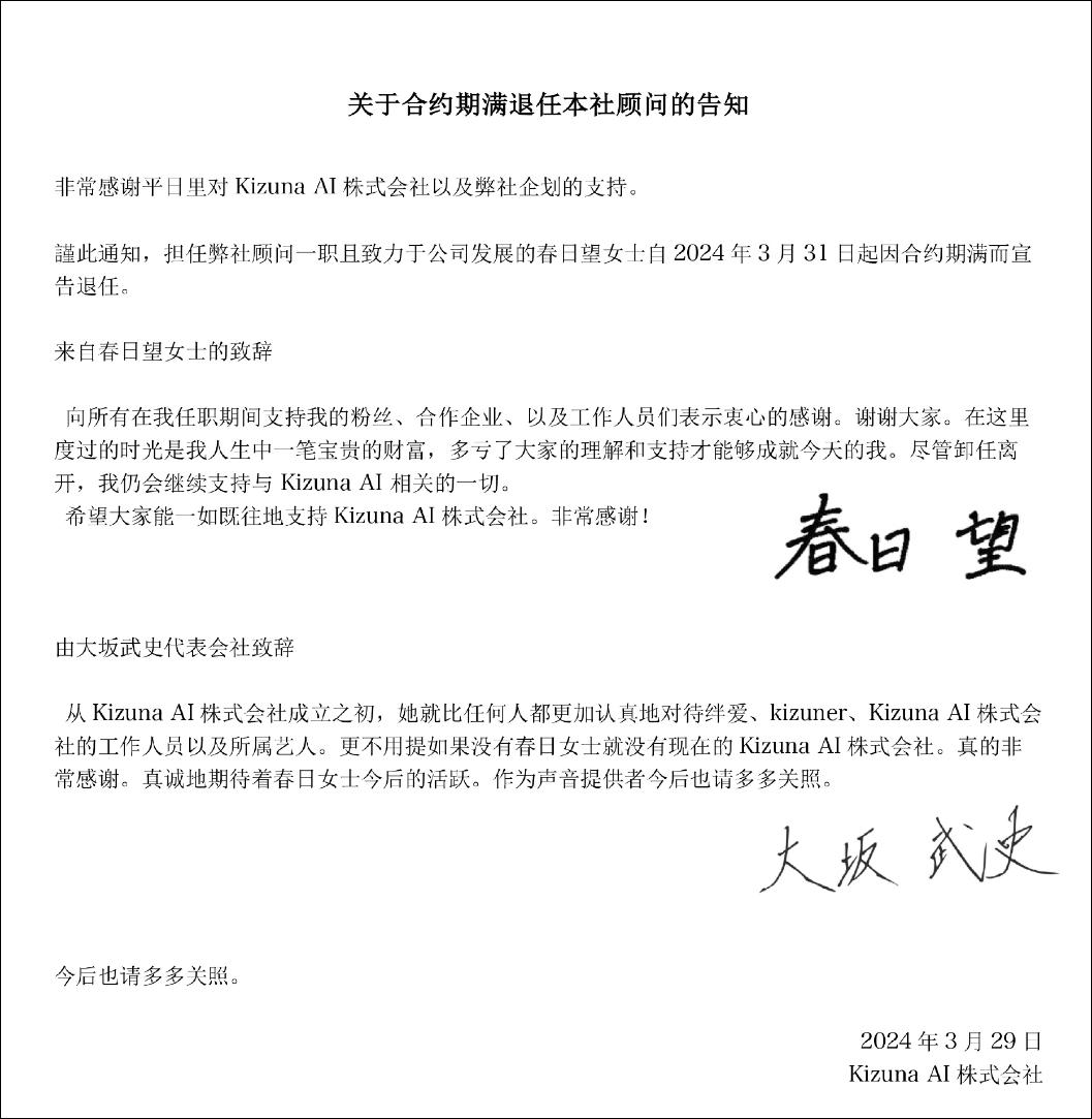春日望女士的致辭: 向所有在我任職期間支持我的粉絲、合作企業、以及工作人員們表示衷心的感謝。謝謝大家,在這裏度過的時光是我人生中一筆寶貴的財富,多虧了大家的理解和支持才能夠成就今天的我。儘管卸任離開,我仍會繼續支持與Kizuna AI相關的一切,希望大家能一如既往地支持 Kizuna AI 株式會社,非常感謝