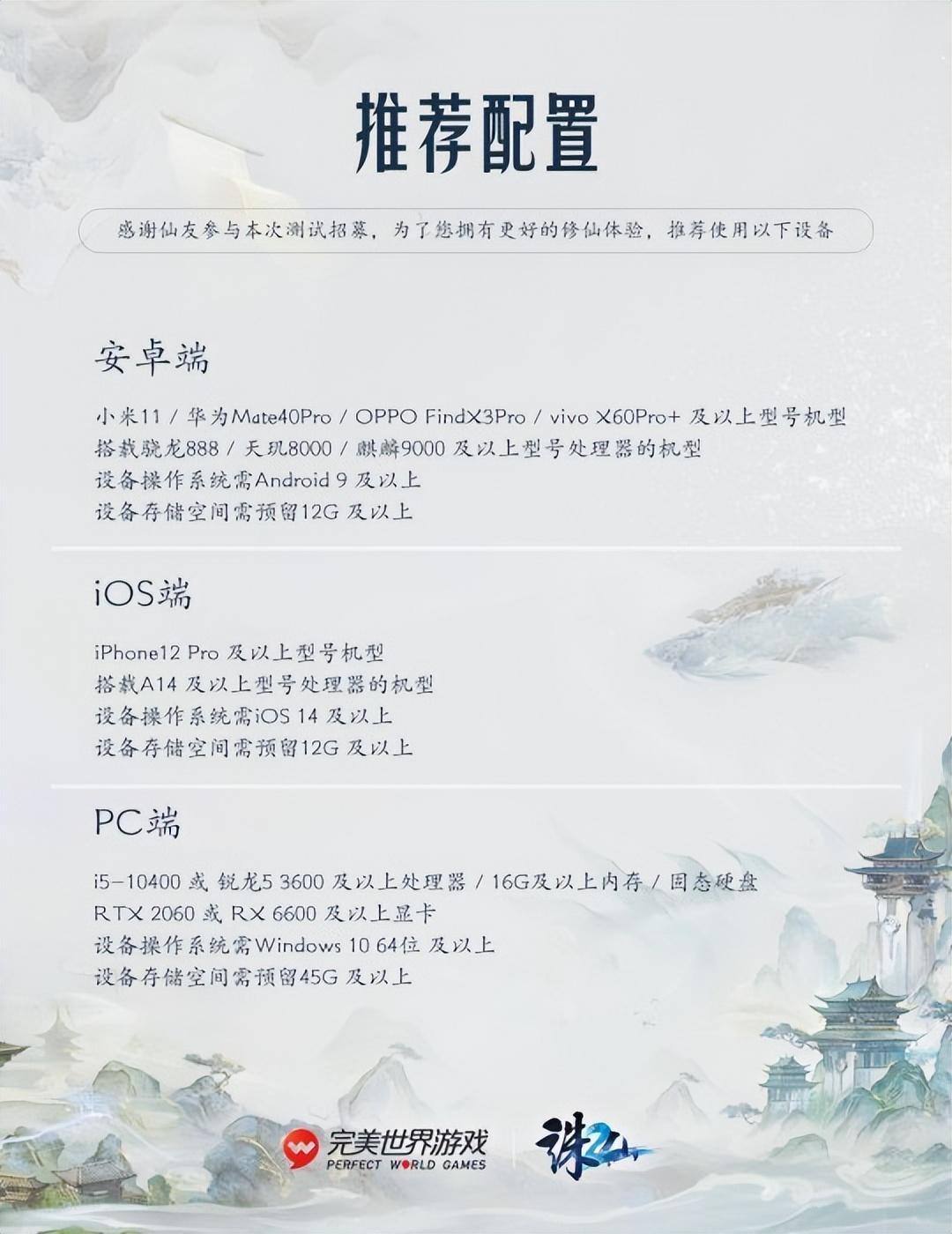 爲了獲得更好的修仙體驗,推薦參與首測的玩家使用高通驍龍888 / 華爲麒麟9000及同等處理器以上設備體驗遊戲。