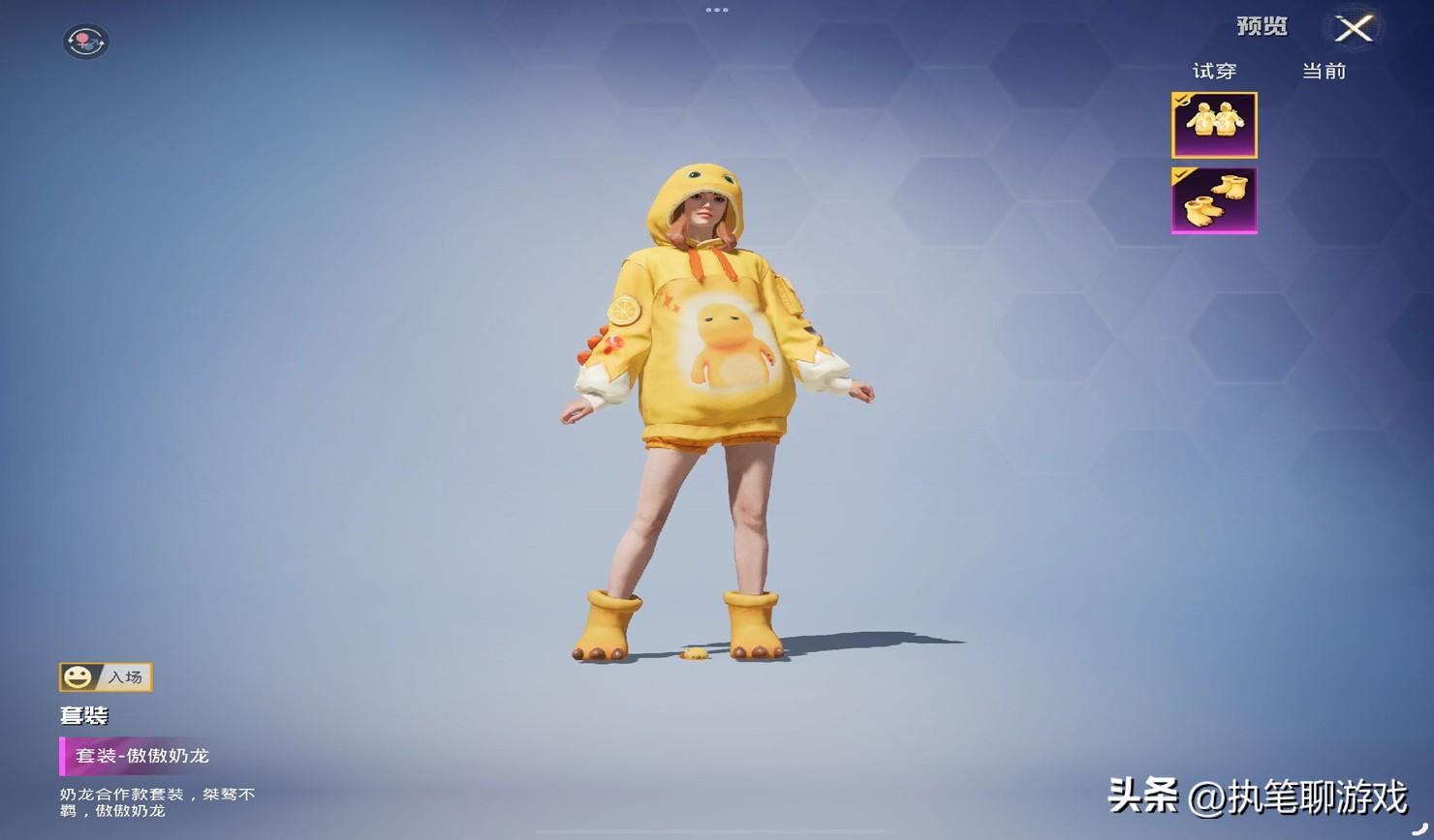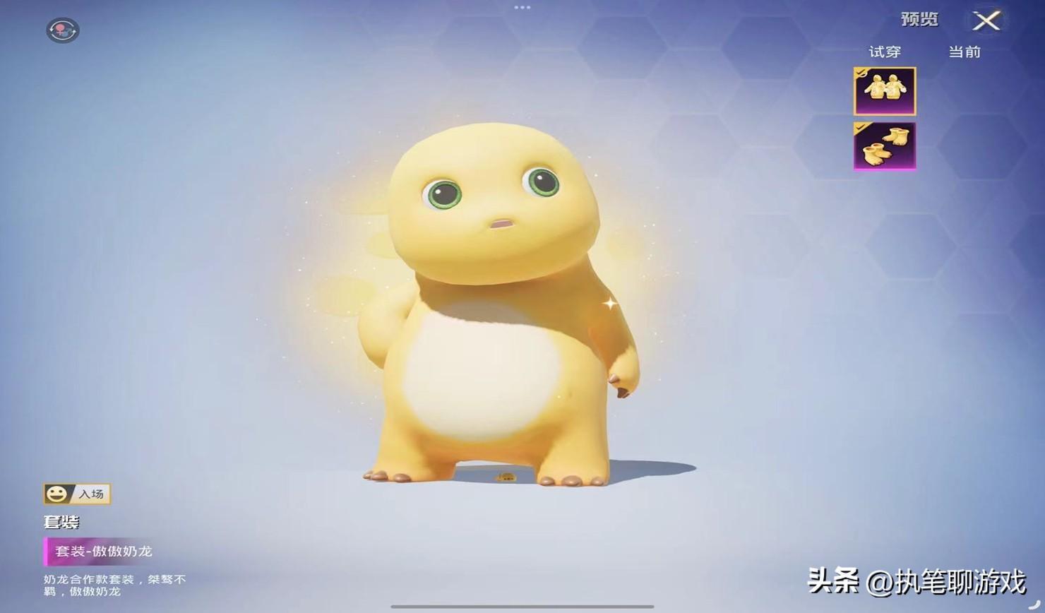 3個套裝屬於聯名合作款的普通粉級衣服,採用如出一轍的顏色搭配,與印象當中被玩家用來壓箱底的“小黃鴨”高度相似,區別只是奶龍的入場動作特效以及衣服上出現的圖案動態特效而已。