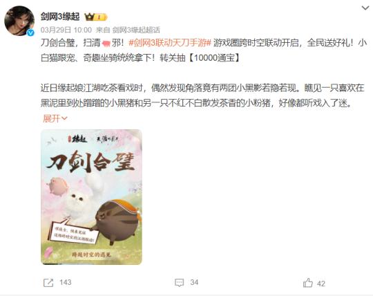 近日,受到網易《射鵰》開服人氣爆棚的壓力影響,《劍網3》正式服與緣起服均開啓了跟天刀手遊的聯動,雙方均上線了小黑豬【黑蹭蹭】、小白貓【噠噠噠】以及小粉豬【粉茶茶】系列外觀道具,暗諷網易方面亂蹭其他遊戲,攪亂武俠遊戲圈。