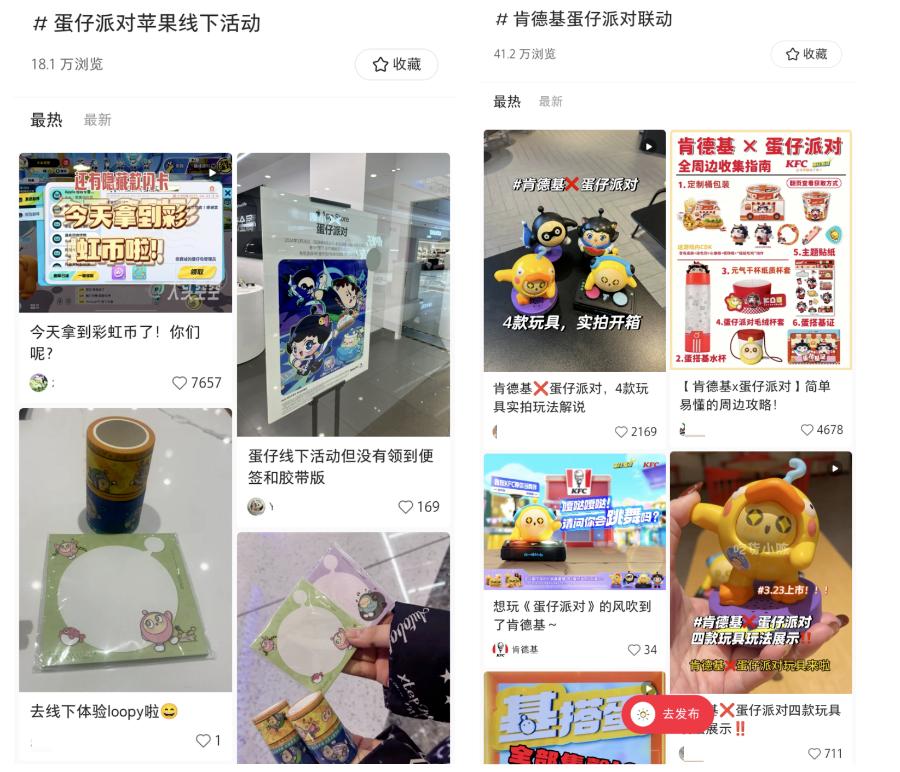 不少蛋仔玩家也挺受用這些活動和福利,小紅書、B站等平臺上能看到他們線下打卡、尋找蛋搭子、安利種草的身影,比如抖音上的#蛋仔派對肯德基聯動 的話題,累計播放量已經超過了5億次。