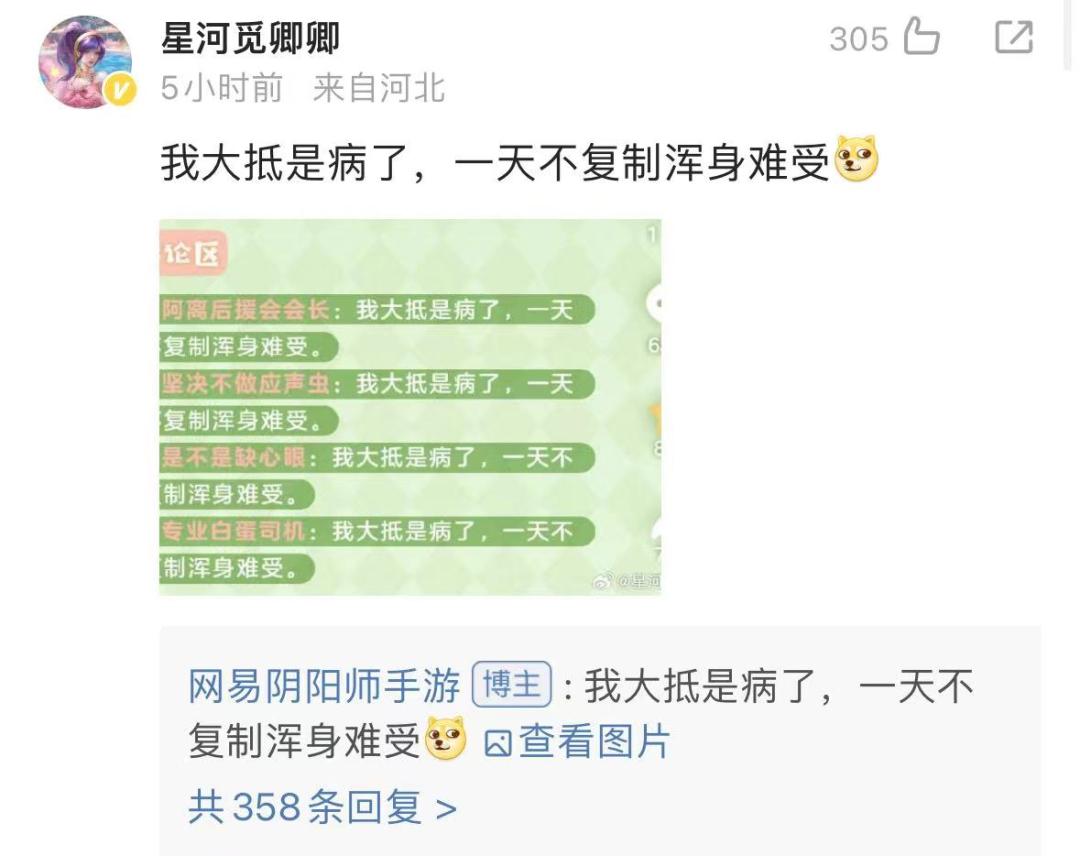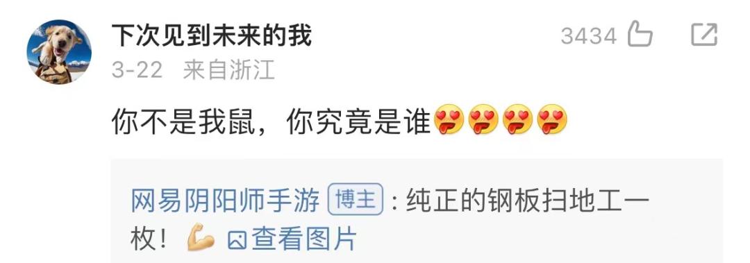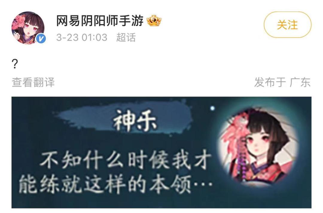 而且關鍵是,雖然它表現得極其硬氣,狂cue友商,但它和最近行業流行的一味發瘋,又不太一樣。觀察《陰陽師》官方微博,其人設和文案屬性,還是有着一股《陰陽師》的味道。