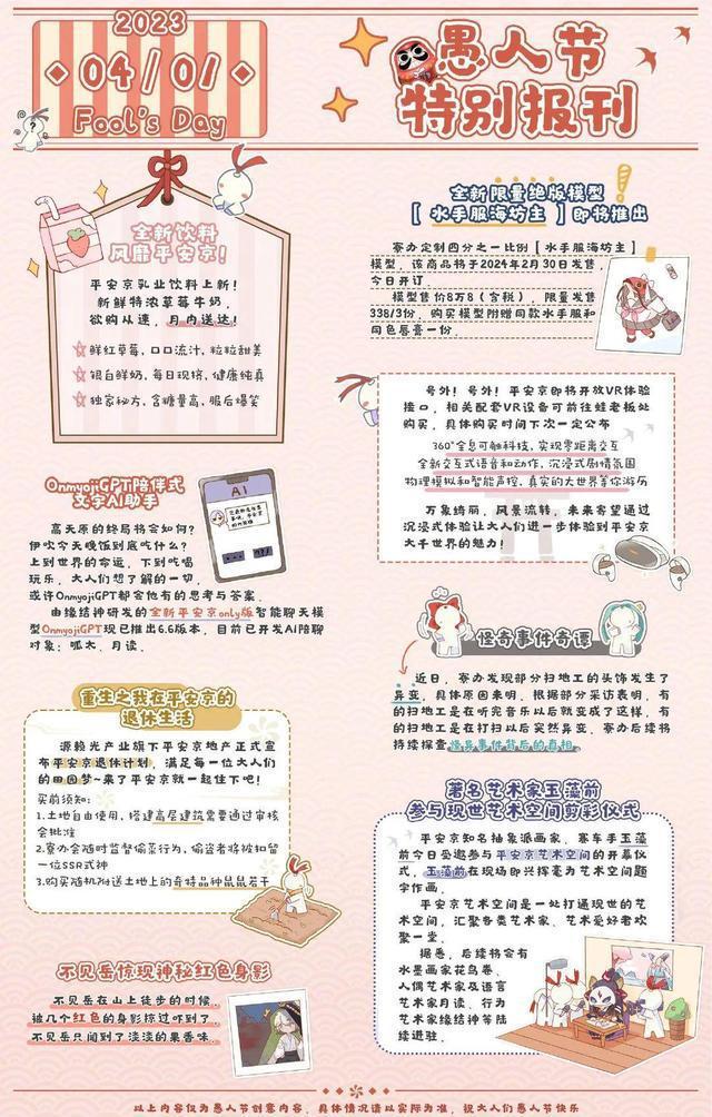 《陰陽師》習慣在愚人節當天,放出一系列「猛料」。去年,他們就一口氣放出了八大情報,像是什麼Onmyoji GPT陪伴式文字AI助手、VR設備接口……一眼過去,你明顯能察覺到,這是蹭熱點的跟風假新聞。