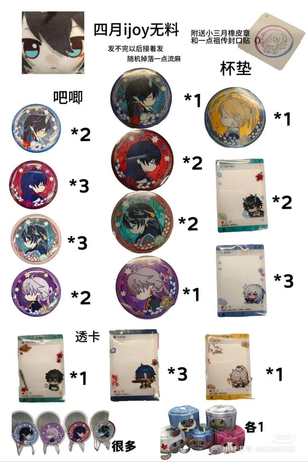 常見無料類型基本爲所推的番劇、角色、CP相關的明信片、貼紙、吧唧(鐵皮徽章)、亞克力製品等,大多製作成本都相對低一些,大部分爲同人製品。