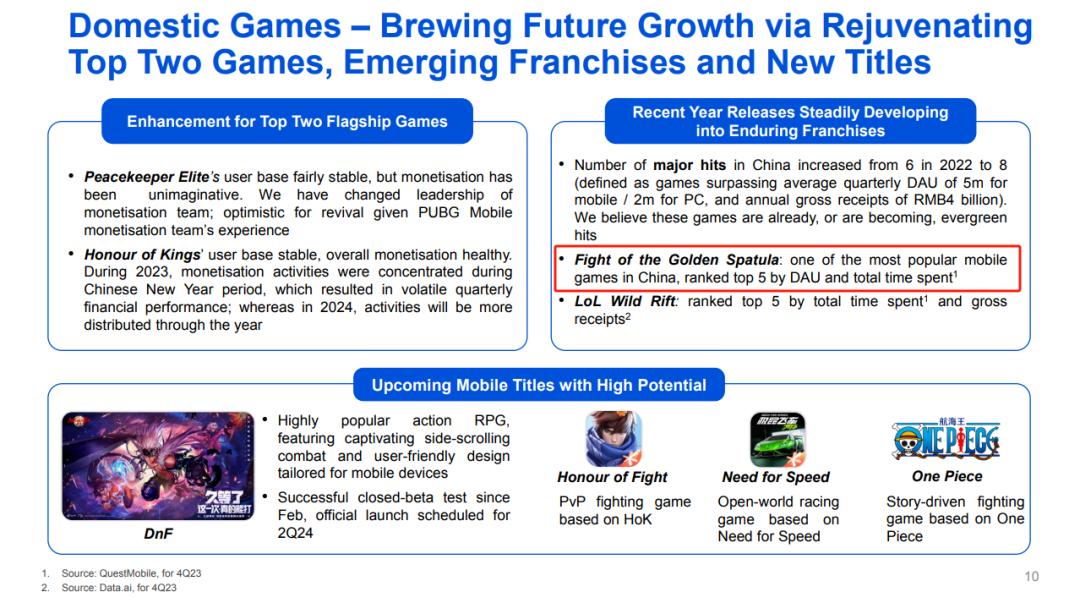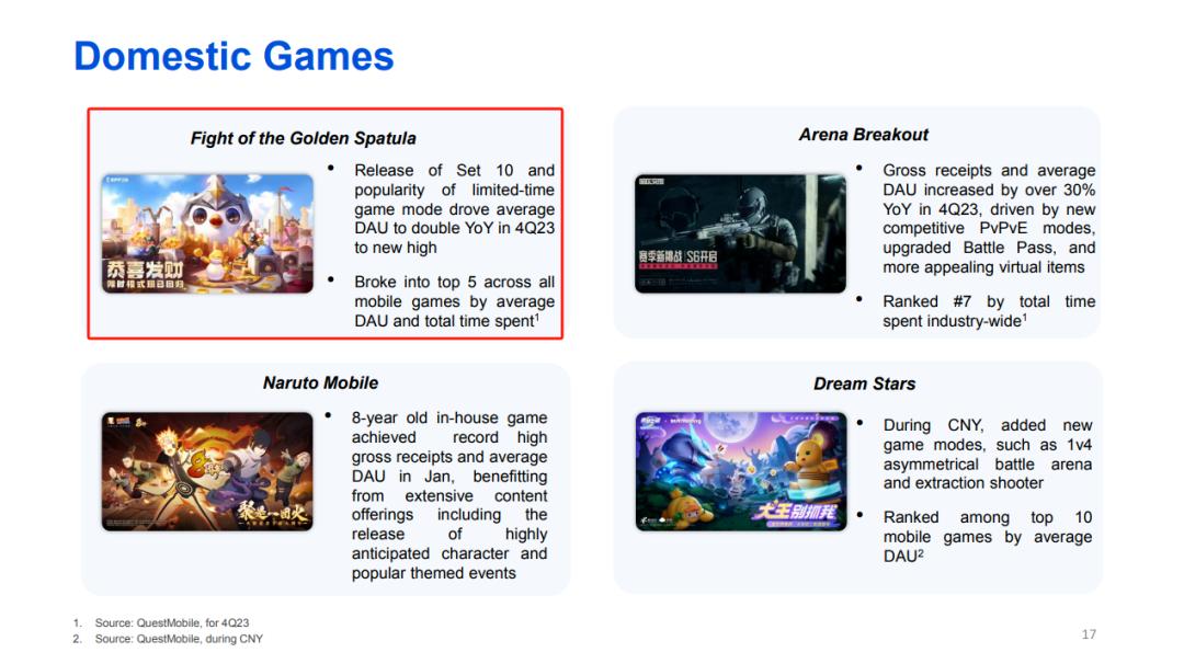 這可不是瞎說。上個月,騰訊公佈了二零二三年全年及第四季業績,財報PPT中就“點名表揚”了《金剷剷之戰》。先是稱它爲“國內最受歡迎的手機遊戲之一”,第四季度的DAU和總遊戲時長能排進國內手遊前5。