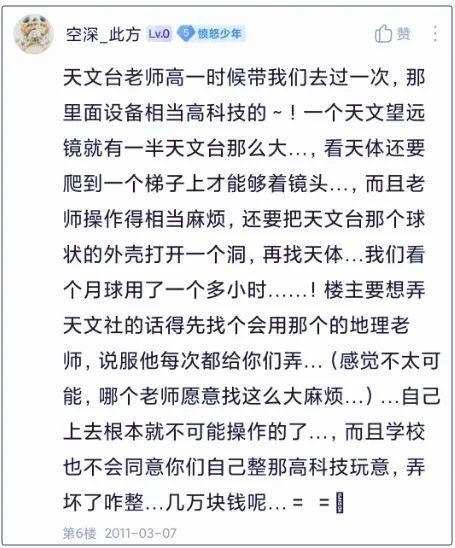 去搜索一下就會發現,如今一些中學裏,少數喜好天文的學生,依舊在試圖爭取天文臺的使用權。他們有的能成功,甚至會獲得上萬元會費;許多則失敗,因爲這是一個競爭殘酷,需要全力以赴應對高考的環境。