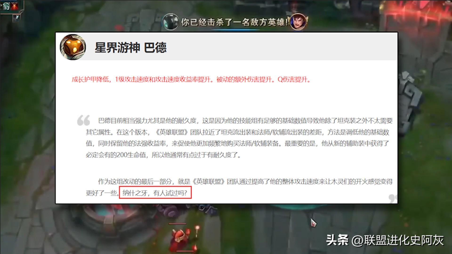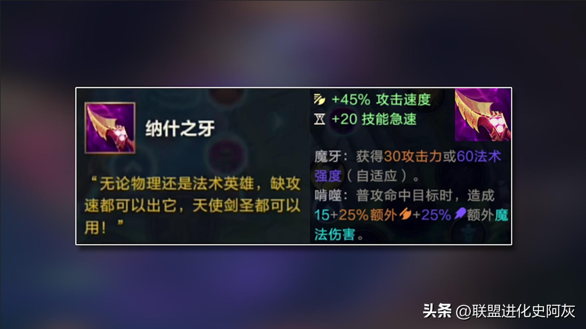 不過話說回來,既然他們這麼想讓納什之牙火,我覺得不妨可以借鑑一下隔壁,那邊出了一個男爵針刺,它把納什之牙的法強變成了自適應力,AD、AP都能出。