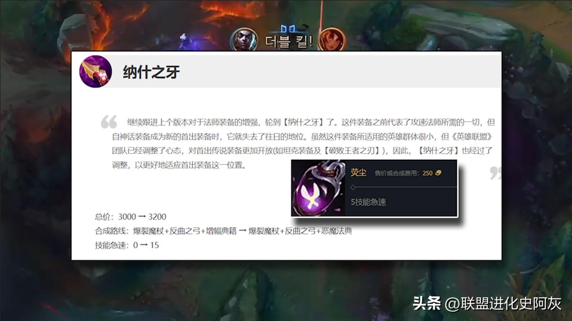 然而設計師並不滿足於此,接着又上演了一波究極心機,5.13版本納什之牙,以10%攻速爲代價換來了20法強,心機在哪兒呢?在之後的5.22版本中,AP裝備迎來集體調整,絕大部分都是削弱,唯獨納什之牙,連帶小件一併加強,一來一去,相當於白嫖了20法強,你說他們沒私心我是不信的。