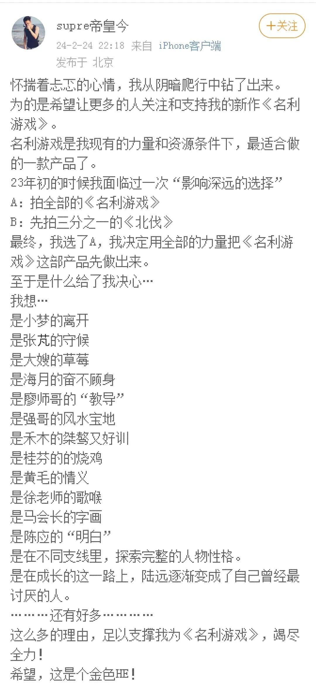 很多人也發現,這款遊戲恰好就是《隱守》導演笛子的新作。此前的他很少在微博上發佈動態,大部分人也不太瞭解這位爆款導演的動向。在《名利遊戲》上線後,他才公開發聲,爲新作宣傳。