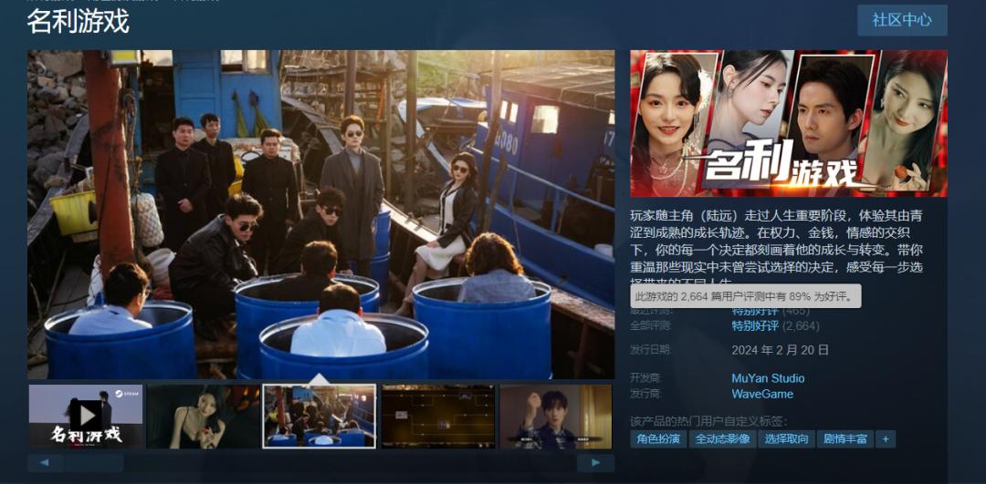 不過在這波熱潮之中,也有一些玩家關注到一款叫《名利遊戲》的互動影遊。它於今年2月上線,在Steam上有89%好評。在劇情方面,它雖然存在一些爭議,但是整體體驗下來,葡萄君可以說,這大概率是自《隱守》之後,國內品質最好的互動影遊之一了。