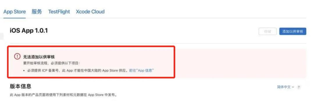 經測試發現,開發者在中國大陸地區提審新App時,會出現“必須提供ICP備案號才能上架”的提示。