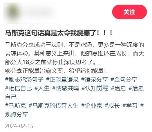 雖然看完這些片兒湯話的雞湯,很難說到底會不會給人啓發,但只要是從馬斯克這種成功人士嘴裏說出來,好像也確實有點道理。