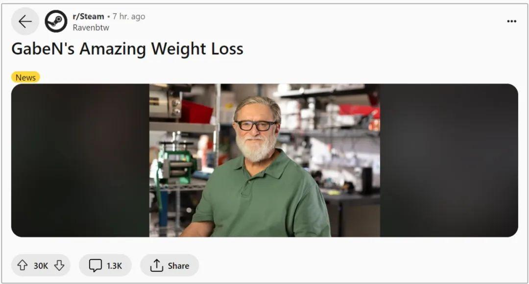 今天Reddit熱門榜第一的帖子,是Steam總裁加布·紐威爾的近照,因爲這個一直以來都被叫G胖的男人,如今的造型已經快要和胖不沾邊了。