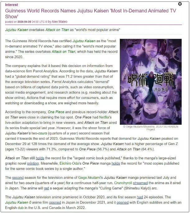 吉尼斯世界紀錄官方認證《咒術回戰》超越《進擊的巨人》,成爲“全球最受歡迎的動畫電視節目”。