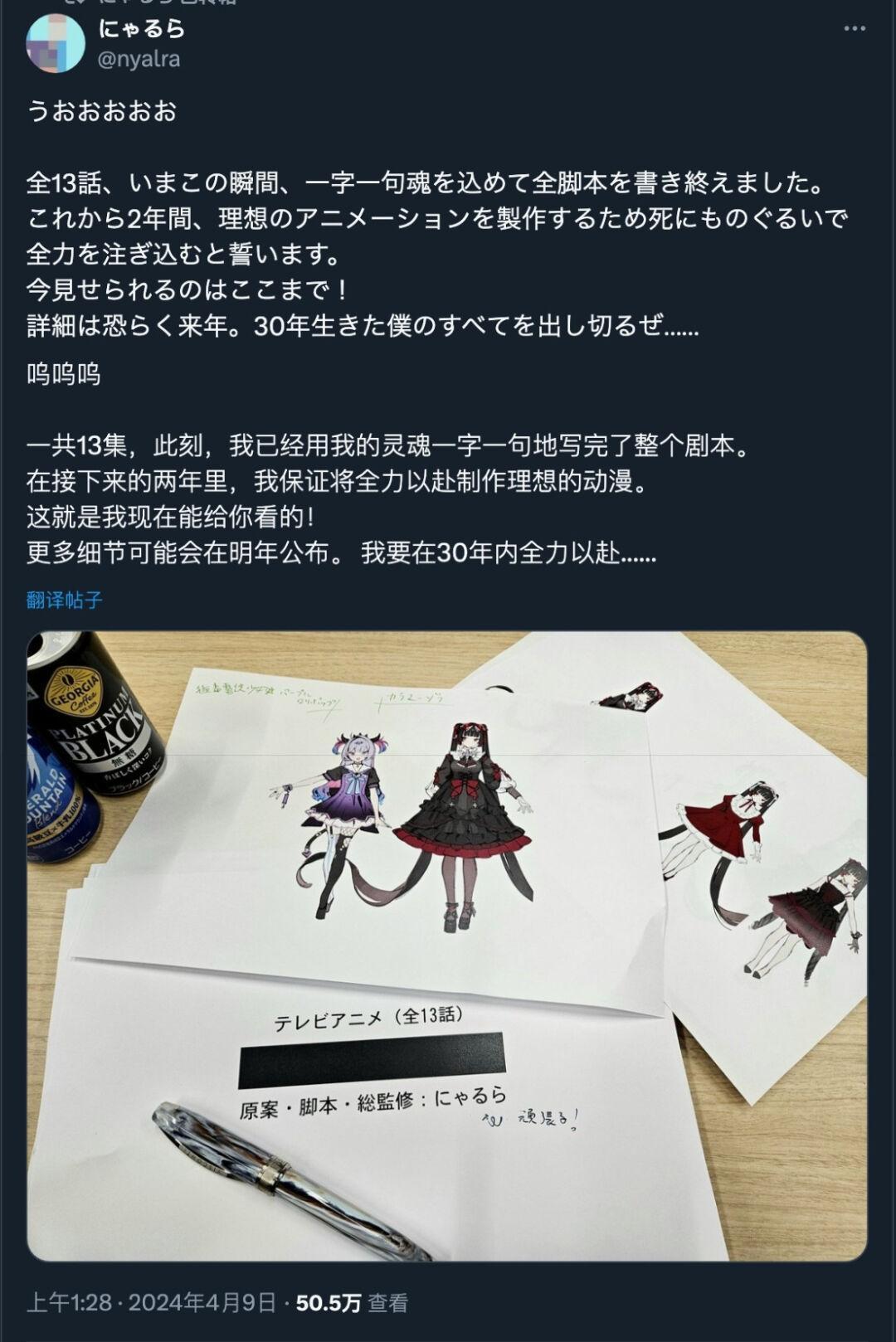 “目前TV動畫全13話的劇本,此時此刻一字一句傾注了全部靈魂終於完成了,我發誓今後2年裏將竭盡全力製作出理想的動畫。”