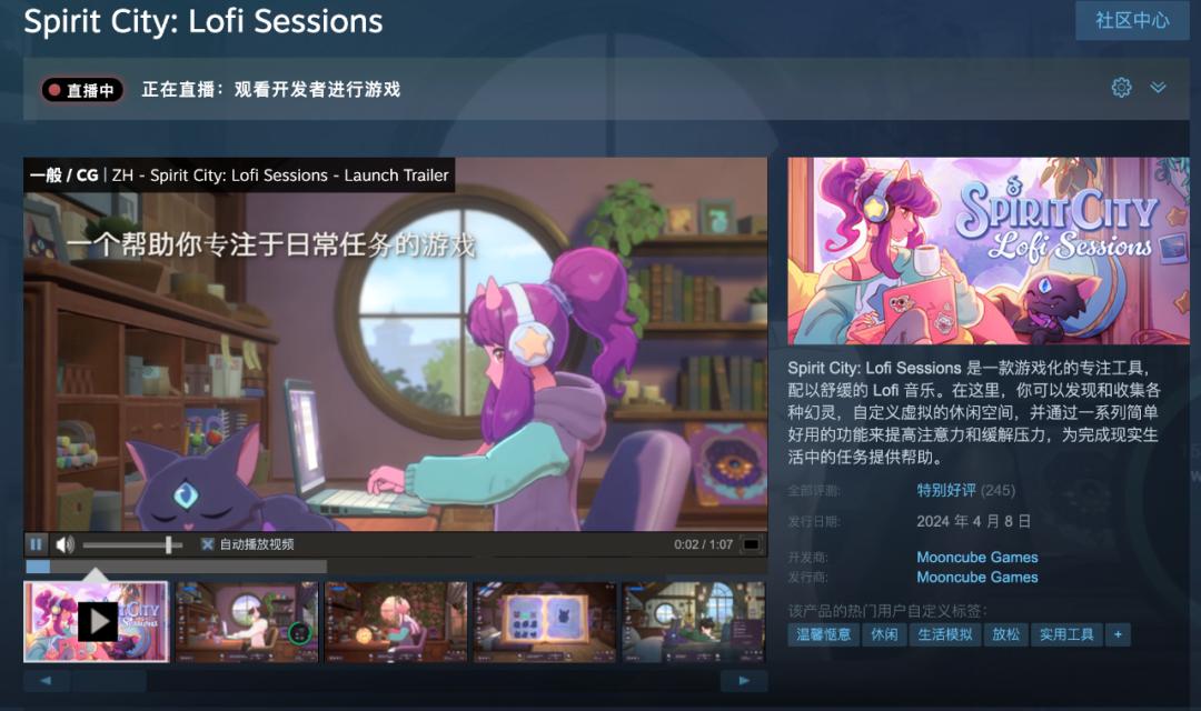 Steam新上線了一個遊戲化專注工具,叫《Spirit City: Lofi Sessions》,蠻有意思的。原價40元,發售折扣價32元,支持中文。
