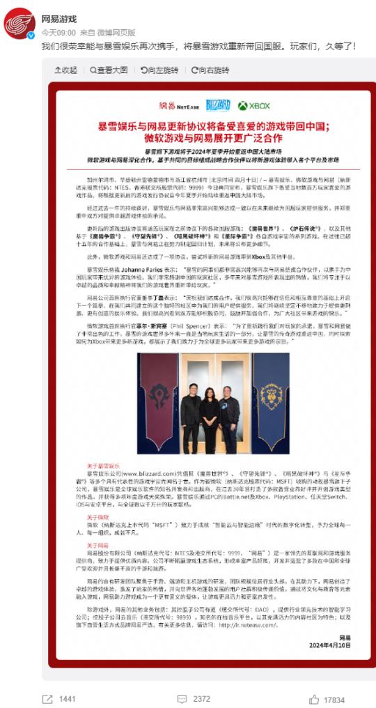 4月10日早上9點,暴雪中國和網易遊戲準時在微博上官宣重啓合作,消息發出後,迅速被頂上了熱搜top1,這一場持續一年多的分手鬧劇,終究是在老岳父微軟的撮合下,走向了複合。