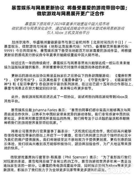 在2024年4月10日,網易官方宣佈將與暴雪再次合作,將暴雪遊戲重新帶回國服。暴雪在2023年1月23日暫停在中國大陸的大部分暴雪遊戲服務,中間還和網易傳出過不和的傳聞。早在之前就傳出過暴雪態度傲慢是關係破裂的主要原因,本次迴歸的因素可能是去年10月,微軟正式宣佈成功收購了動視暴雪。