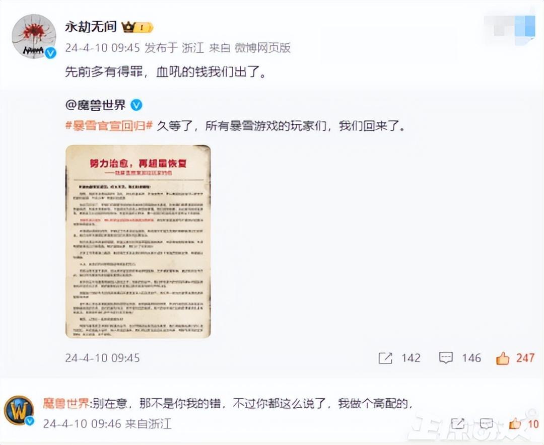 當然並不是所有人都很開心暴雪的迴歸,比如之前騰訊旗下一直在官宣是《魔獸世界》的“平替”手遊《塔瑞斯世界》,官博連發多條微博表示對暴雪迴歸的震驚。