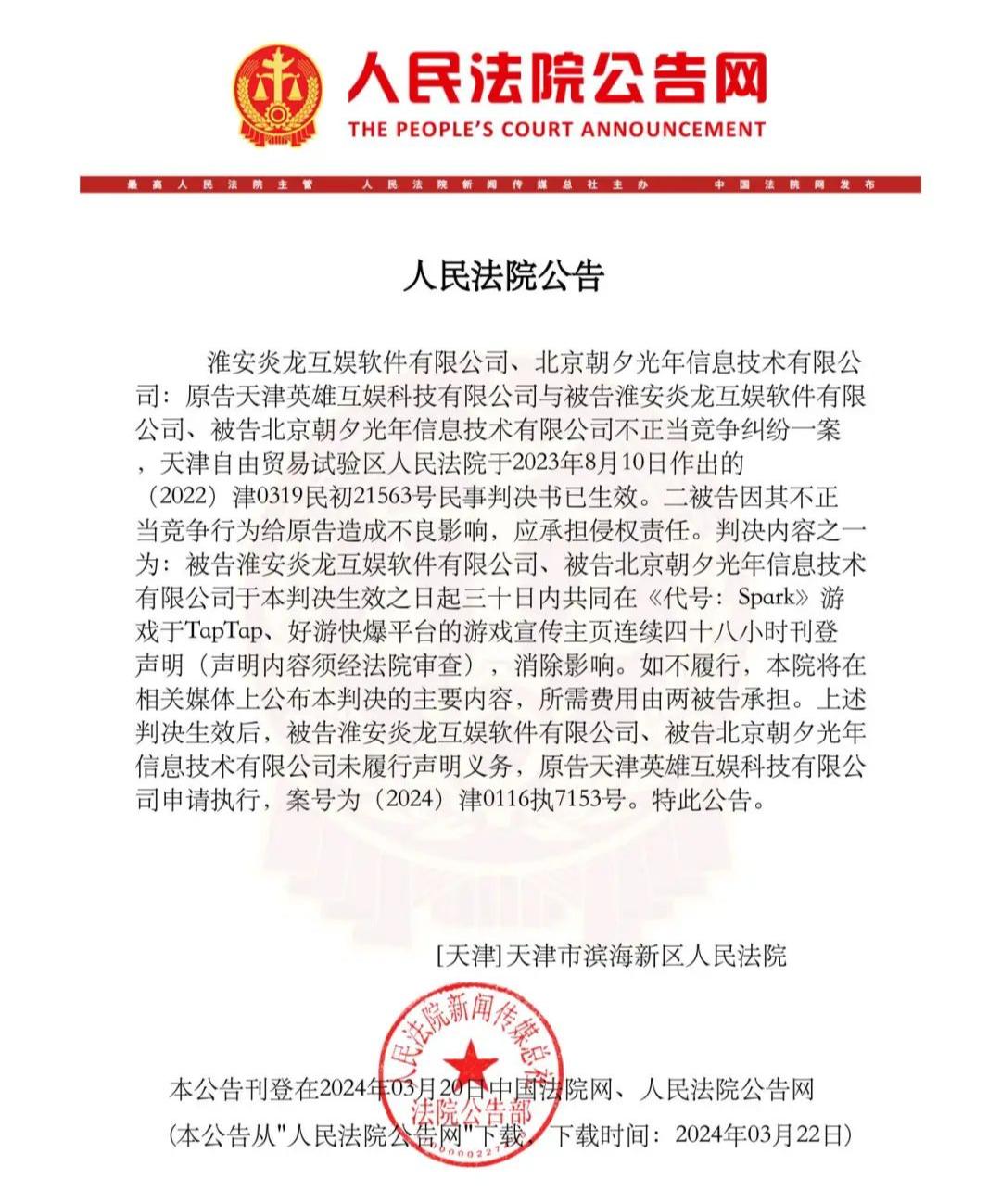 關於淮安炎龍等使用「炎龍游戲」宣傳其遊戲《代號:Spark》的不正當競爭案二審已結束,二審法院亦認爲淮安炎龍等公司使用「炎龍游戲」宣傳其遊戲《代號:Spark》等行爲構成不正當競爭,維持一審判決,判令淮安炎龍等公司立即停止不正當競爭行爲、發佈聲明消除影響,並賠償英雄遊戲40萬元的經濟損失和合理開支。