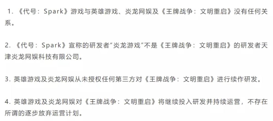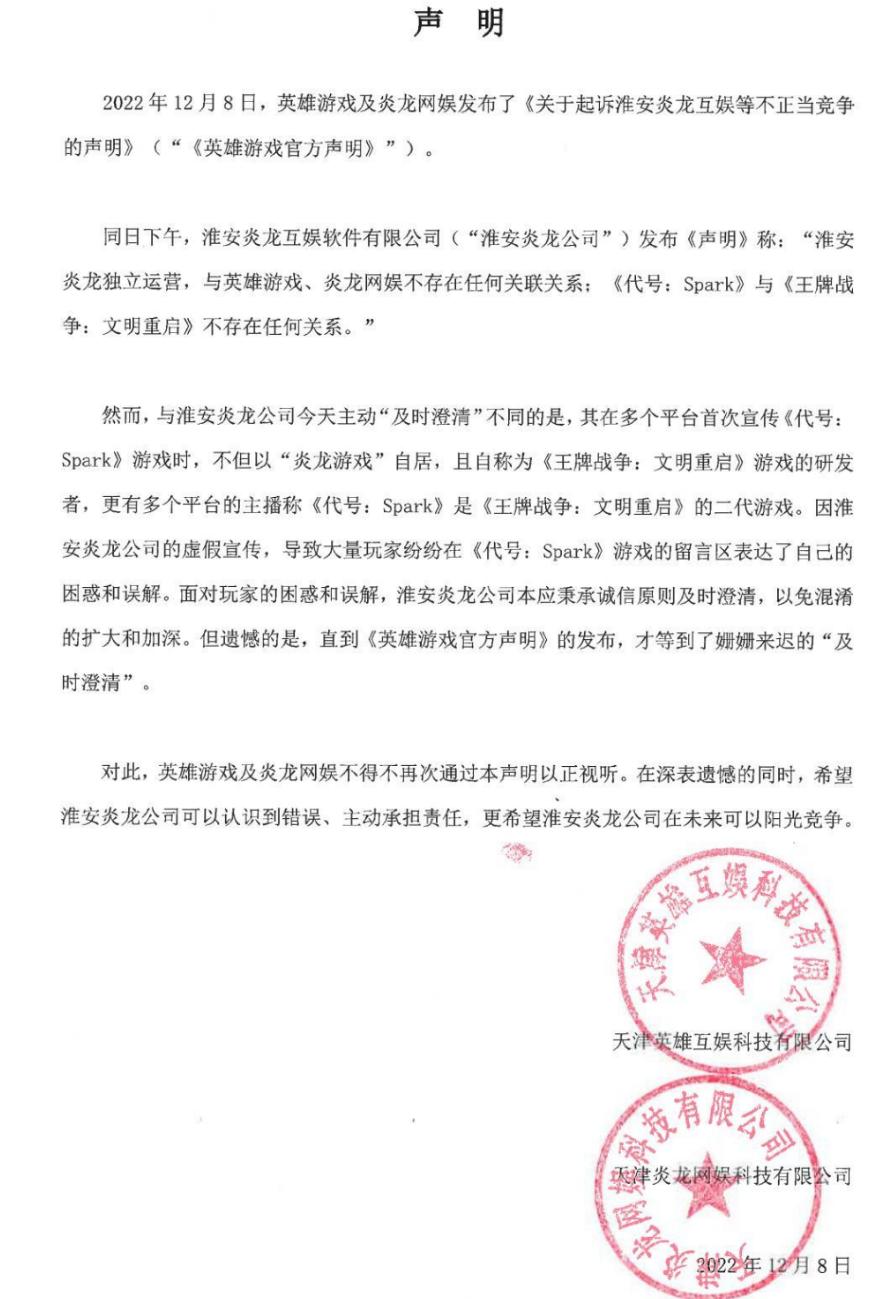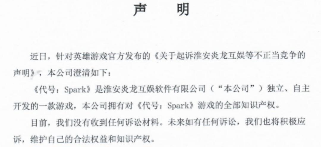 隨後英雄遊戲一邊向法院提起訴訟,一邊發佈聲明,稱《代號:SPARK》及淮安炎龍,與《王牌戰爭》及其研發商炎龍工作室沒有任何關係,並表示對此前《代號:SPARK》的宣傳內容讓部分玩家產生誤解的情況追責。