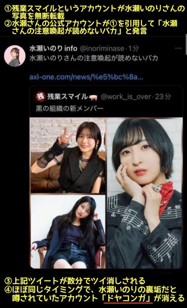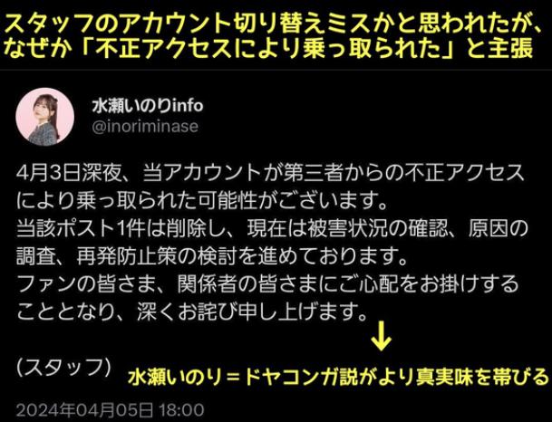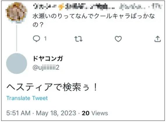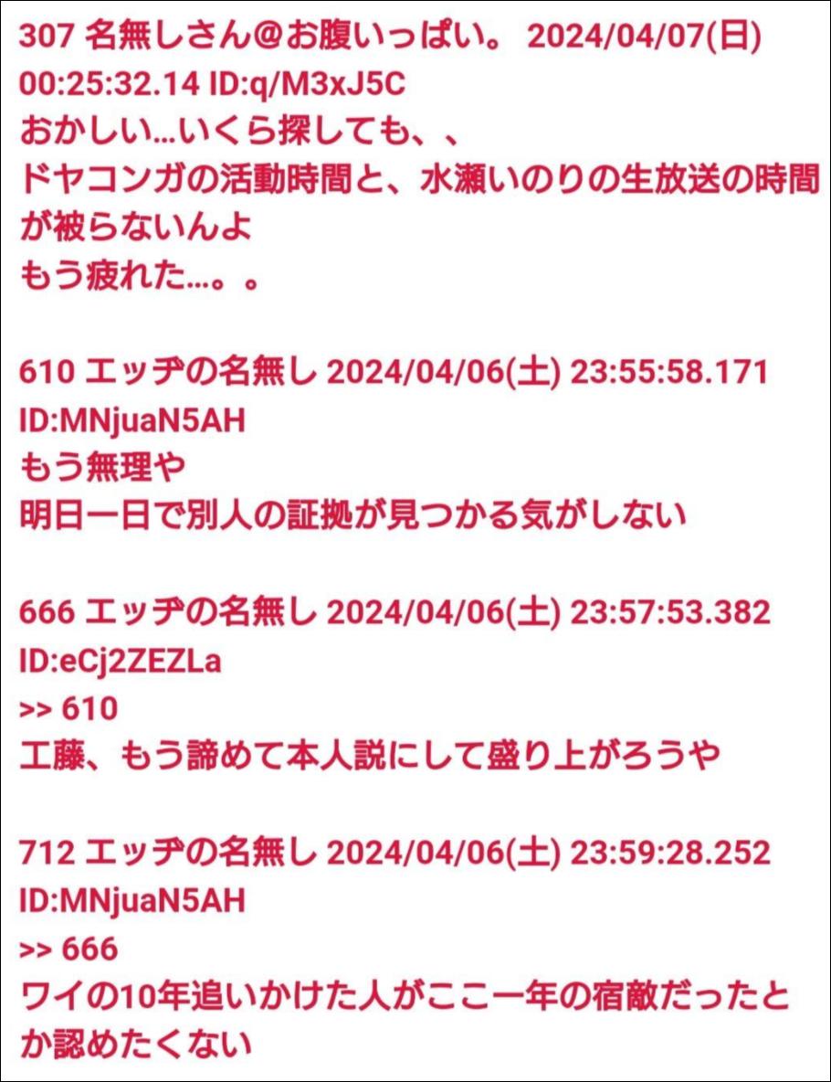 有人認爲水瀨祈官方刪掉的這條推文,措辭上非常像 5ch 論壇上一個ID爲“ドヤコンガ”的網友。