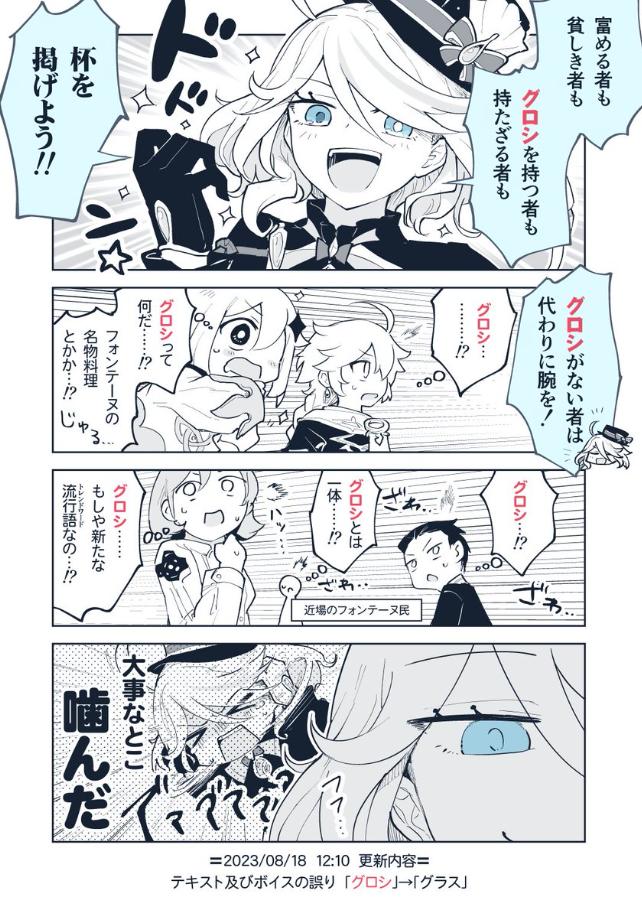 “ドヤコンガ”曾調侃過《原神》日配臺本的問題,在給芙寧娜配音的過程中,她曾把一整段的“グラス”(玻璃杯)給念成了“グロシ”(guroshi,日語沒這個詞,猜測是Glossy,有光澤的)。