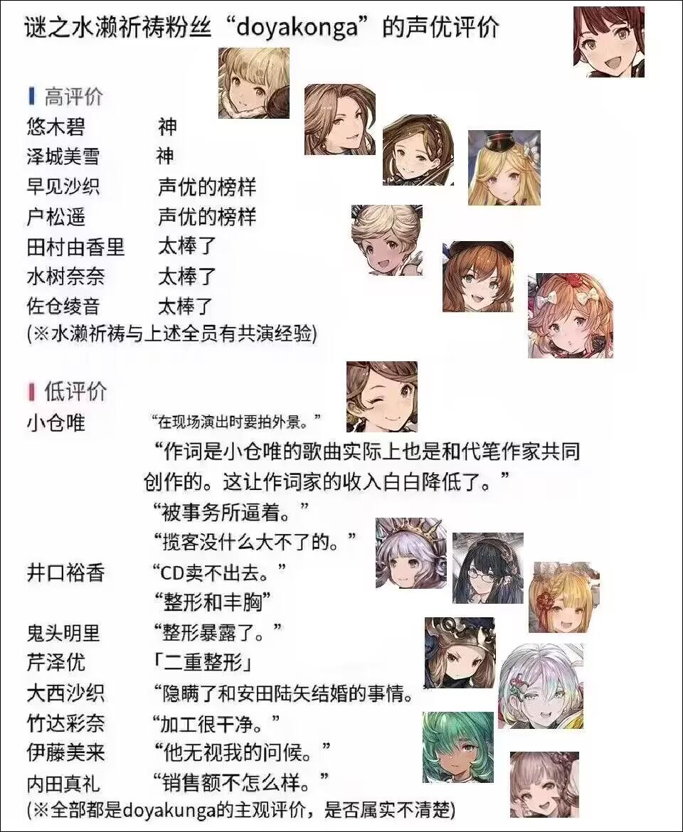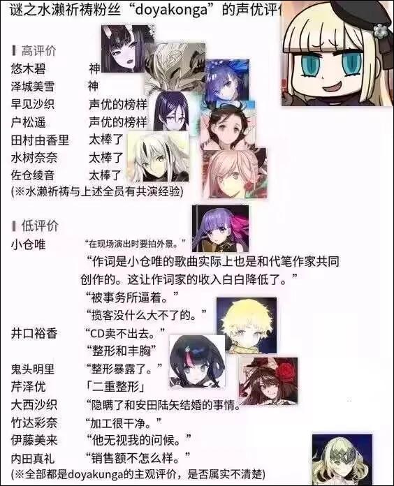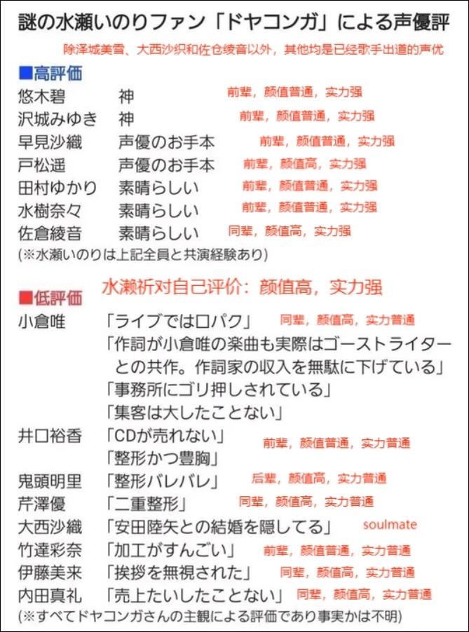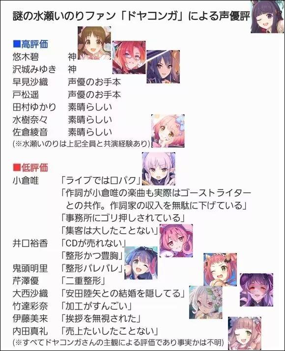 在賬號註銷後,有人整理出了一張“ドヤコンガ”對其他女聲優的評價彙總。