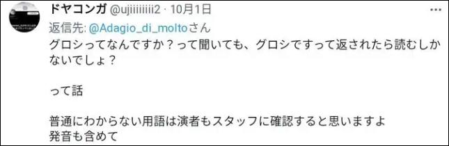 “ドヤコンガ”在推特上說:“我“問guroshi到底是個什麼東西,得到的答覆是‘就是guroshi’,一般情況下聲優看到搞不懂的專門用語都會找staff確認的吧?”