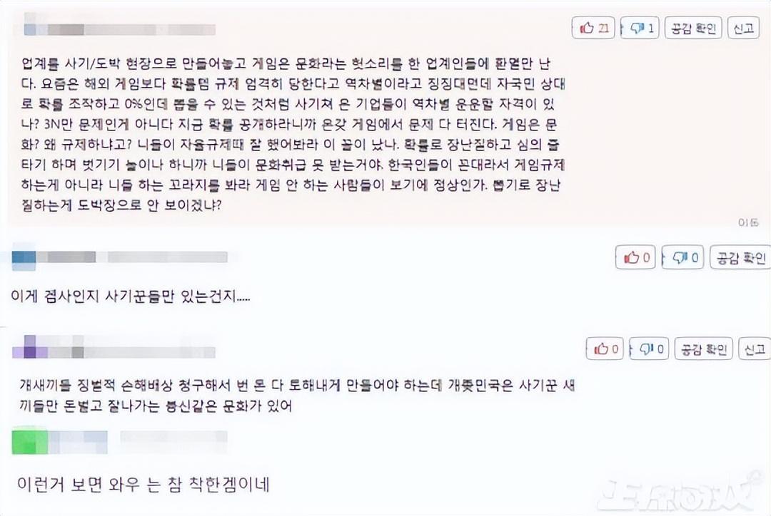 有韓國玩家直言,韓國遊戲行業讓人失望,嘴上說的搞韓國遊戲文化,卻把這個行業變成中國澳門d場。之前一直說國內監管過於嚴格,就讓你們行業自律自查,結果如今搞出0%的概率來。有玩家就吐槽,這就一家騙子公司。還有暴怒玩家表示,要對這些公司進行重罰讓他們把賺到的錢都吐出來,“詐騙”這就是這個國家的一種文化,只有騙子才能發財。還有網友調侃,這樣一對比《魔獸世界》的確是神作。