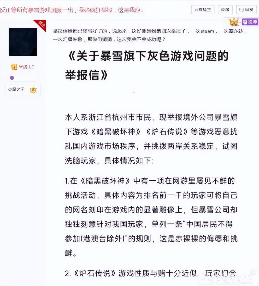 近日一位名叫“米線山”的網友在網上發帖稱,只要暴雪遊戲國服出來,他就會瘋狂的舉報,還在網上曬出了早就寫好的舉報信,信的內容大意就是說暴雪的遊戲都是有問題,說《暗黑破壞神》夫人雕像刻名活動不允許中國內地玩家參與是有zz問題,還說《爐石傳說》涉嫌db。