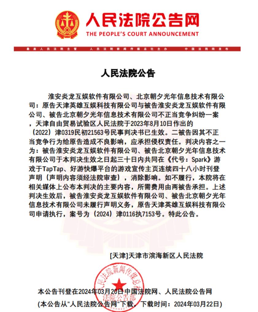 目前英雄遊戲已向法院申請強制執行賠償款,且由於淮安炎龍等並未履行刊登聲明、消除影響等義務,經英雄遊戲申請,人民法院公告網刊登了案件的相關公告。
